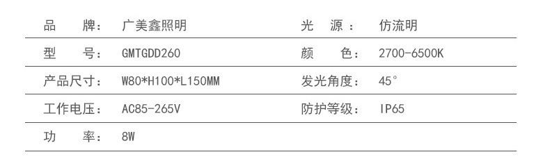 | 防護(hù)等級(jí) | IP65 | 光源功率 | 8W | 電壓 | AC85-265V |